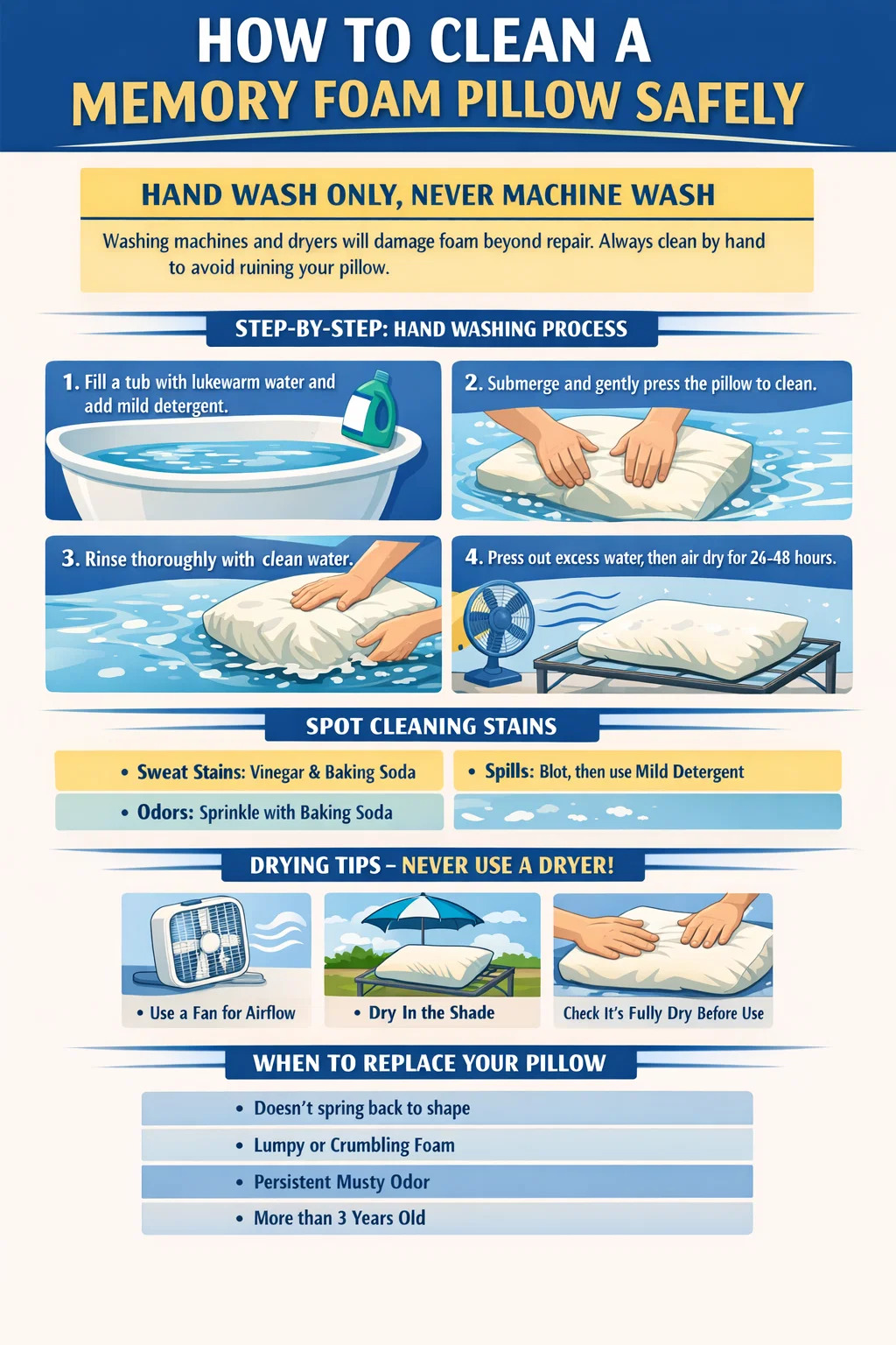 These are the most common type and the most sensitive to over-wetting. Because they are a single dense block, water takes the longest to penetrate and then exit. The hand wash method described above is the standard approach. Prioritize the least water exposure possible while still achieving cleaning — if spot cleaning can address the issue, it always should. A solid memory foam pillow that gets fully saturated may take 3–4 days to dry completely in average indoor conditions.