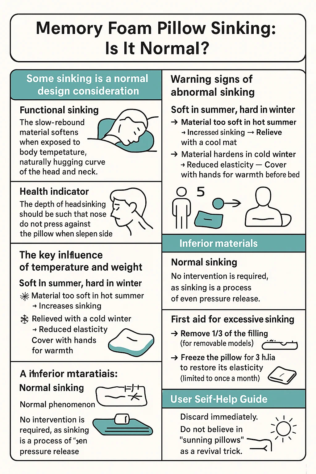 Elsősegély a túlzott süllyedéshez: → Töltse le a töltés 1/3 -at (eltávolítható modellekhez) → Helyezzen egy hajtogatott törülközőt a párnahuzat alá az ideiglenes támogatáshoz → Három órán át fagyasztja a párnát, hogy helyreállítsa rugalmasságát (havonta egyszer korlátozva).
